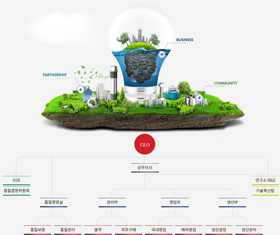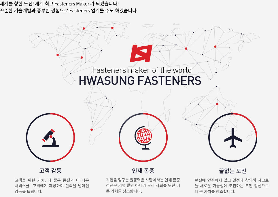 당사는 1988년 창립 이래 특수 Fasteners 분야에서 독보적인 기술을 발판으로 선두 역할을 주도하고 있는 일류 Fasteners 제조 기업입니다. 그리고 지속적인 기술 개발과 그 동안 쌓아온 경험과 노하우를 통해 초저온, 초고온, 초고압 등의 극한의 환경에서도 고객의 Spec 요구조건을 충족시켜 드릴 수 있는 특수 제품을 국내외 까다로운 공사에 공급해 왔습니다.
